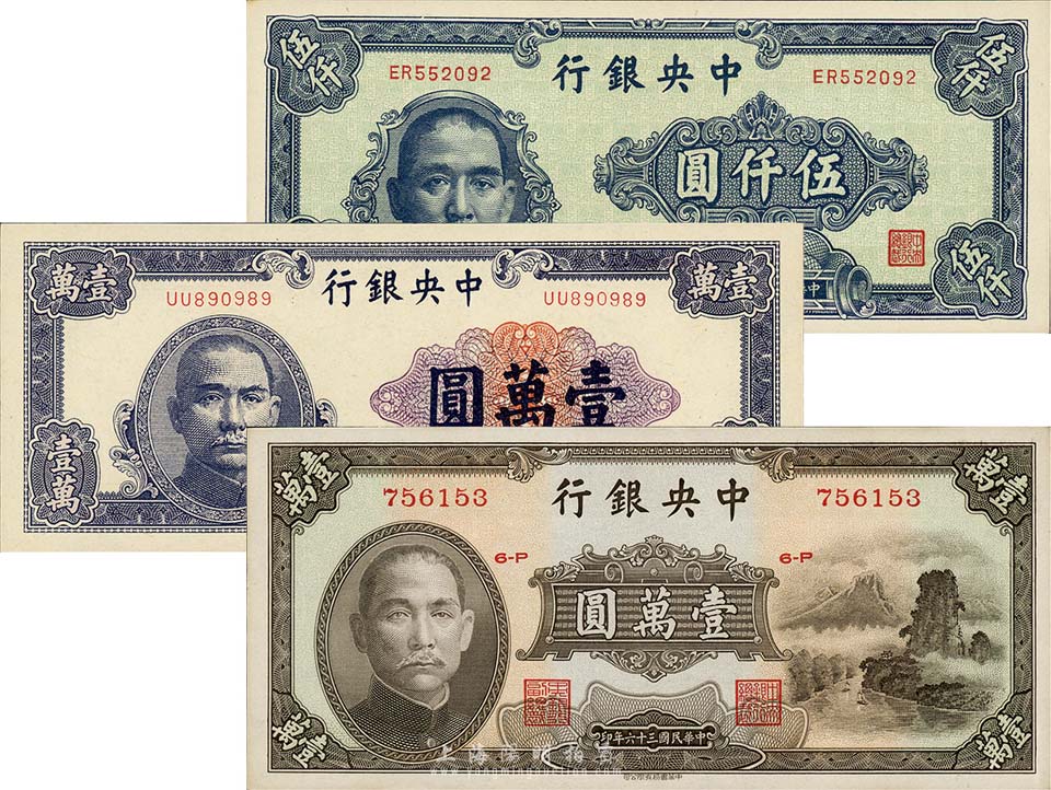 民国三十六年(1947年)中央银行中华版伍仟圆、“小山水”壹万圆、紫色壹万圆共3枚不同,森本勇先生藏品,九八至全新