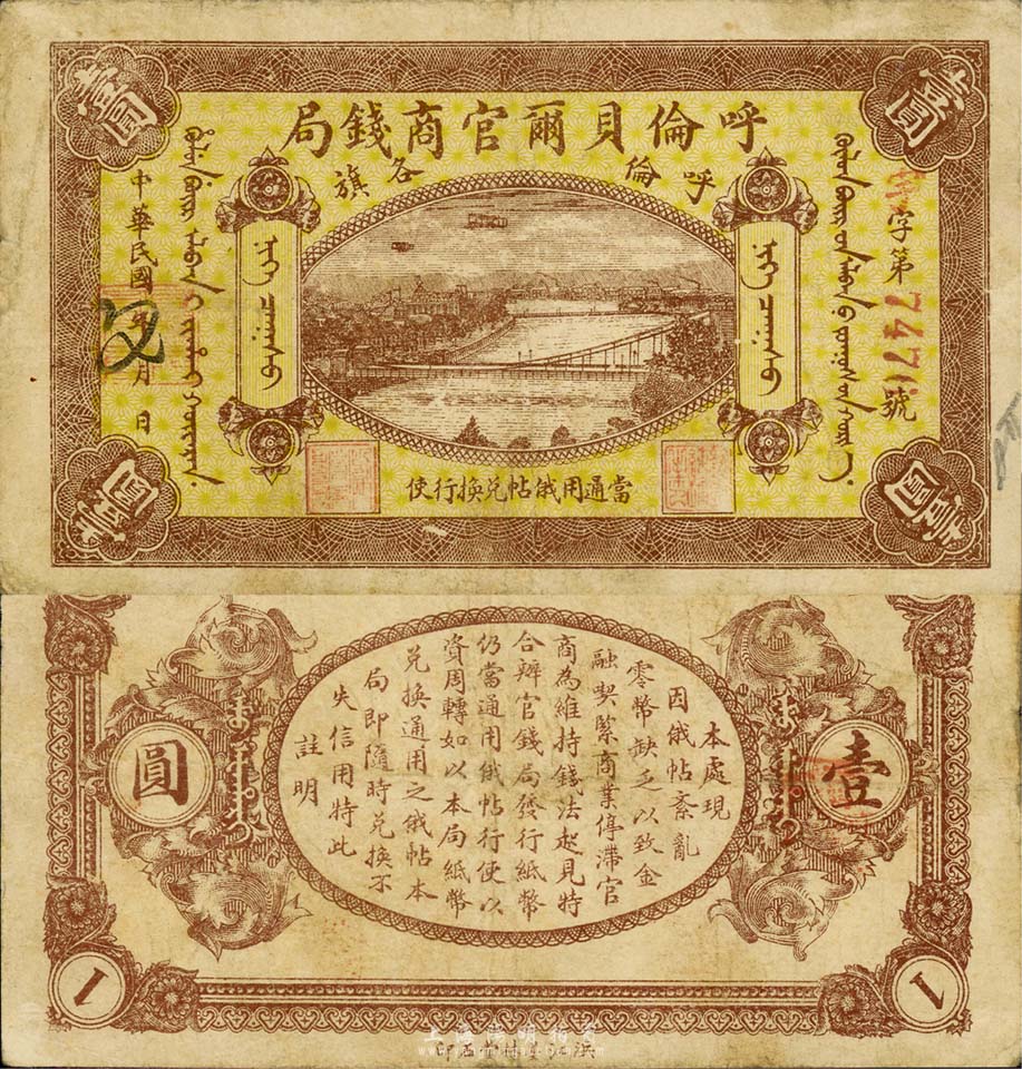 民国八年(1919年)呼伦贝尔官商钱局壹圆,红色4位数号码券;森本勇先生藏品,近八成新