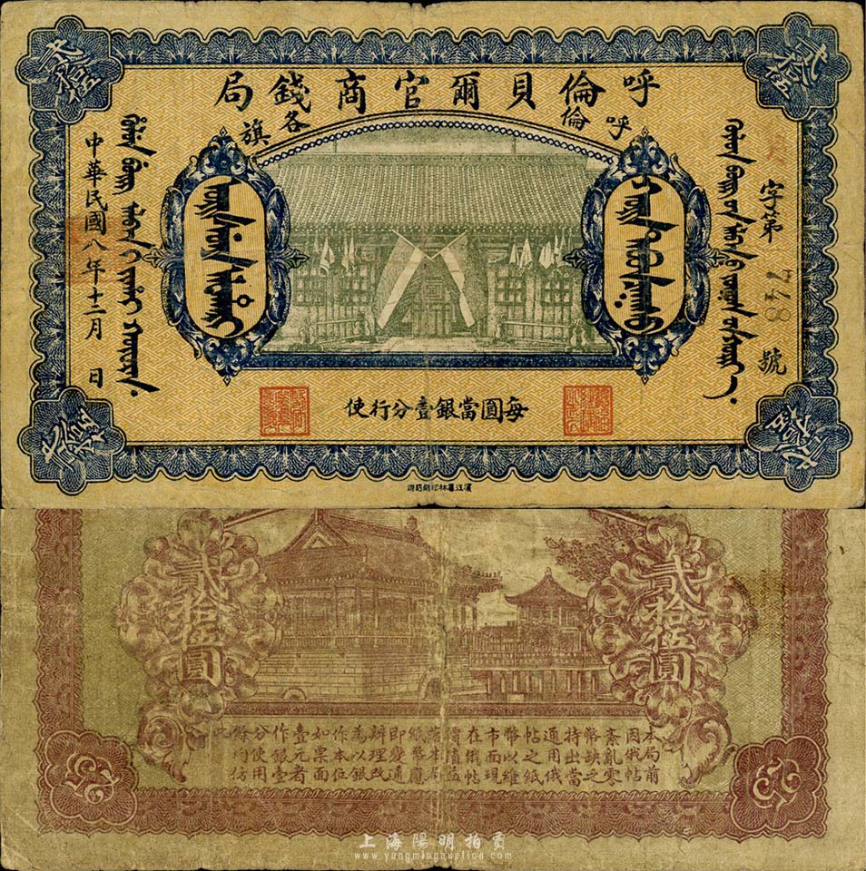 民国八年(1919年)呼伦贝尔官商钱局贰拾伍圆,黑色3位数号码券;森本勇先生藏品,七五成新