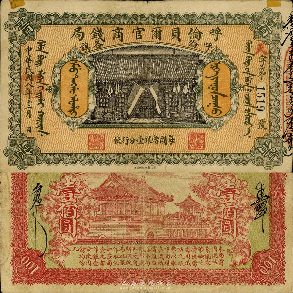 民国八年(1919年)呼伦贝尔官商钱局壹百圆,黑色4位数号码券;森本勇先生藏品,少见,上有小贴痕,近八成新