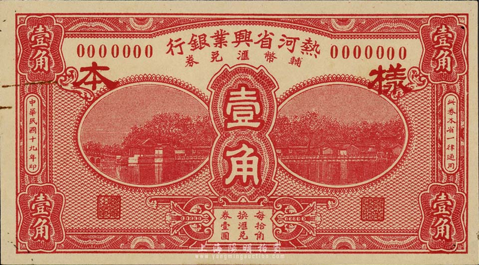 民国十九年(1930年)热河省兴业银行辅币汇兑券壹角样本券,正背共2枚,森本勇先生藏品,九六成新