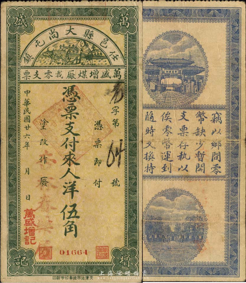 民国廿六年(1937年)万盛增煤厂找零支票洋伍角,任邑县大尚屯镇地名,森本勇先生藏品,少见,七五成新