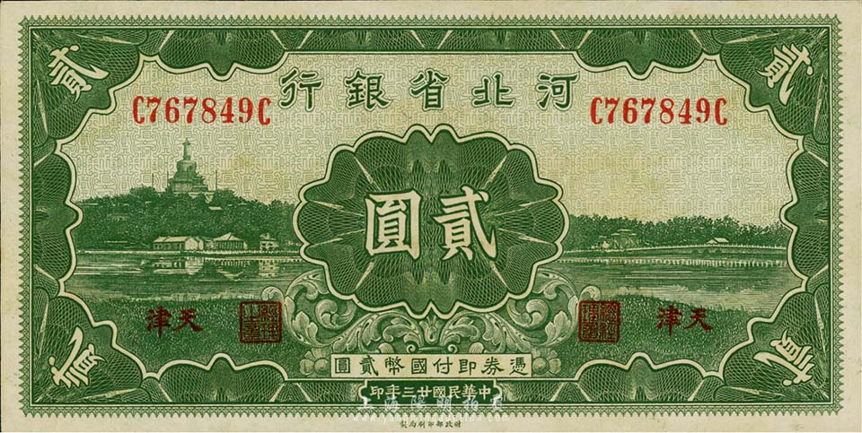 民国廿三年(1934年)河北省银行贰圆,天津地名,森本勇先生藏品,九八成新