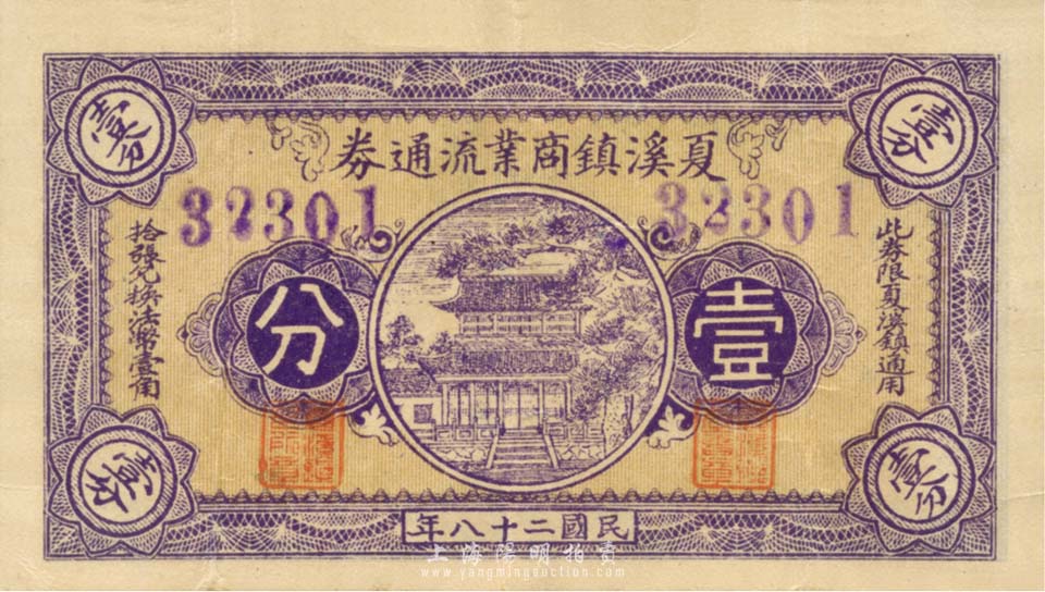 民国二十八年(1939年)夏溪镇商业流通券壹分,上印大殿图,抗战时期江苏常州武进县地方辅币,或由商会社团发行;森本勇先生藏品,少见,八成新