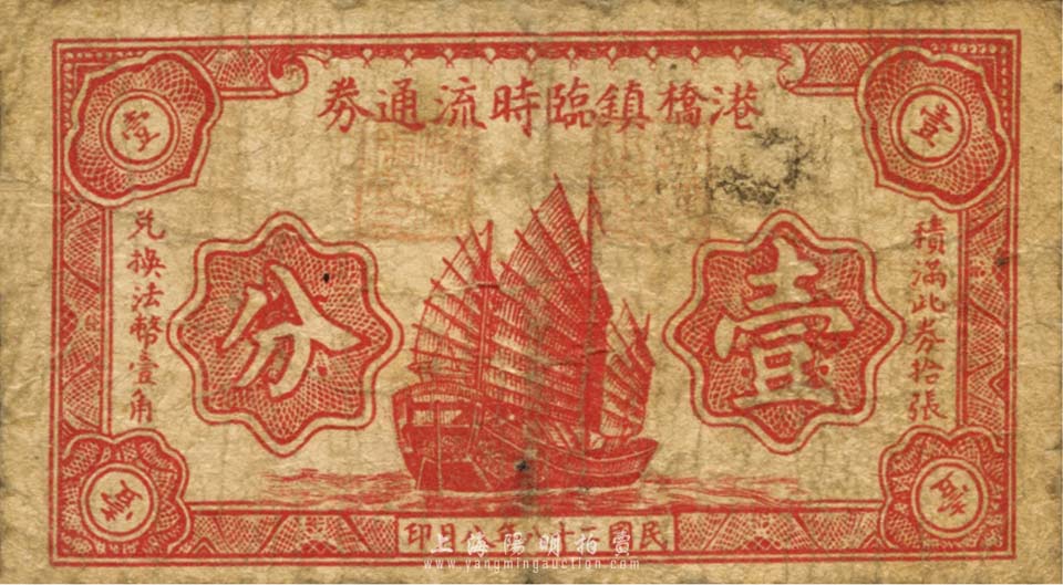 民国二十八年(1939年)港桥镇临时流通券壹分,正背均印帆船图,抗战时期江苏常州武进县地方辅币,或由商会社团发行;森本勇先生藏品,少见,近七成新
