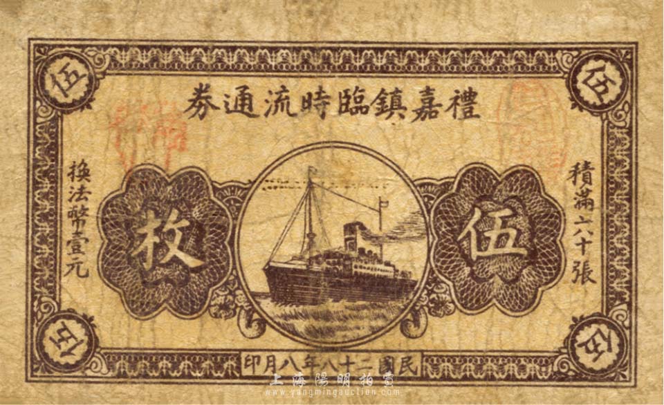 民国二十八年(1939年)礼嘉镇临时流通券铜元伍枚,上印轮船图,抗战时期江苏常州武进县地方辅币,或由商会社团发行;森本勇先生藏品,少见,七成新