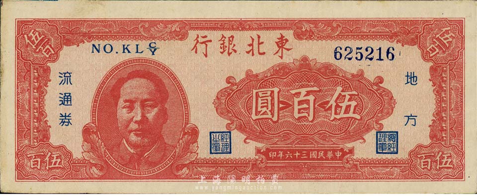 民国三十六年(1947年)东北银行地方流通券伍百圆,左边印红色毛泽东像,森本勇先生藏品,九成新