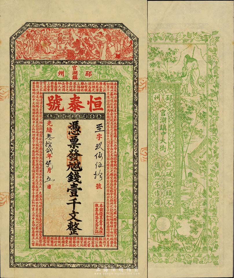 光绪叁拾贰年(1906年)恒泰号·九九二钱壹千文,江苏徐州府邳州官湖镇钱庄钞票,上印红楼梦等仕女图及唐王勃《滕王阁序》古文,背印竹林七贤图,上海申昌印、吴松卿绘稿,图案精美;资深藏家出品,罕见,九成新