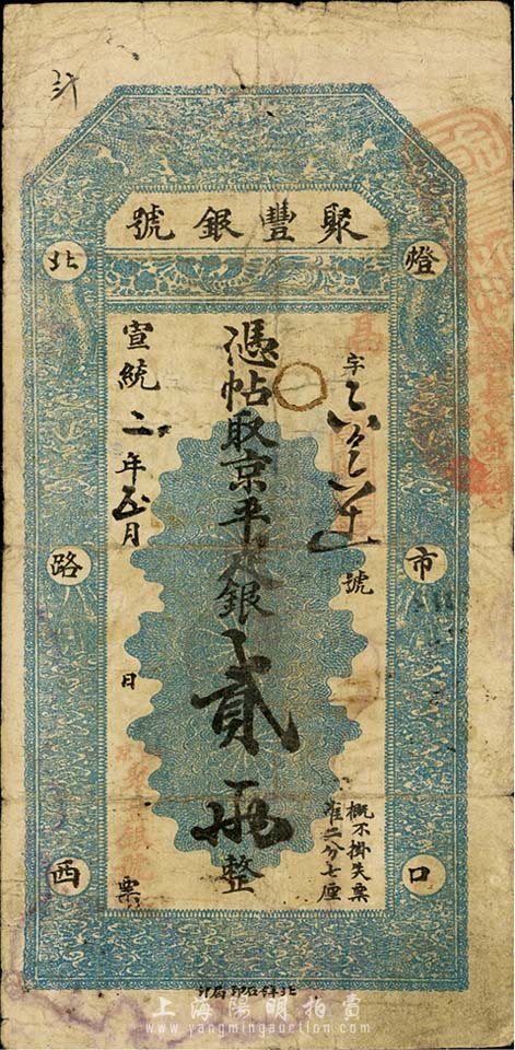 宣统二年(1910年)北京·聚丰银号京平足银贰两,台湾藏家出品,七五成新