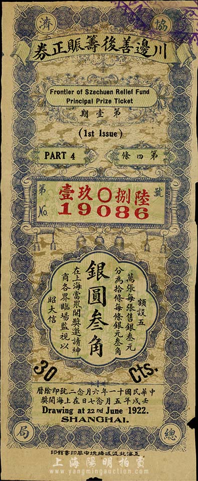 民国十一年(1922年)川边善后筹赈正券第壹期银圆叁角,四川老彩票之少见品,海外藏家出品,七五成新