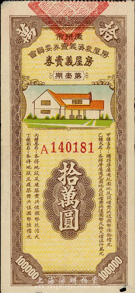 民国时期·广州市房屋救济义卖券委员会房屋义卖券第壹期拾万圆,以彩票形式发行,八成新