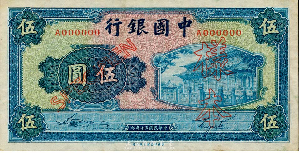 民国三十年(1941年)中国银行商务版岱庙图伍圆样本券,正背共2枚,此种样本券存世十分罕见;海外藏家出品,九至九五成新
