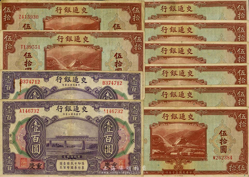 交通银行纸币共10枚,详分:1914年重庆壹百圆2枚、1941年美钞版单字轨伍拾圆8枚,海外回流,七至八成新