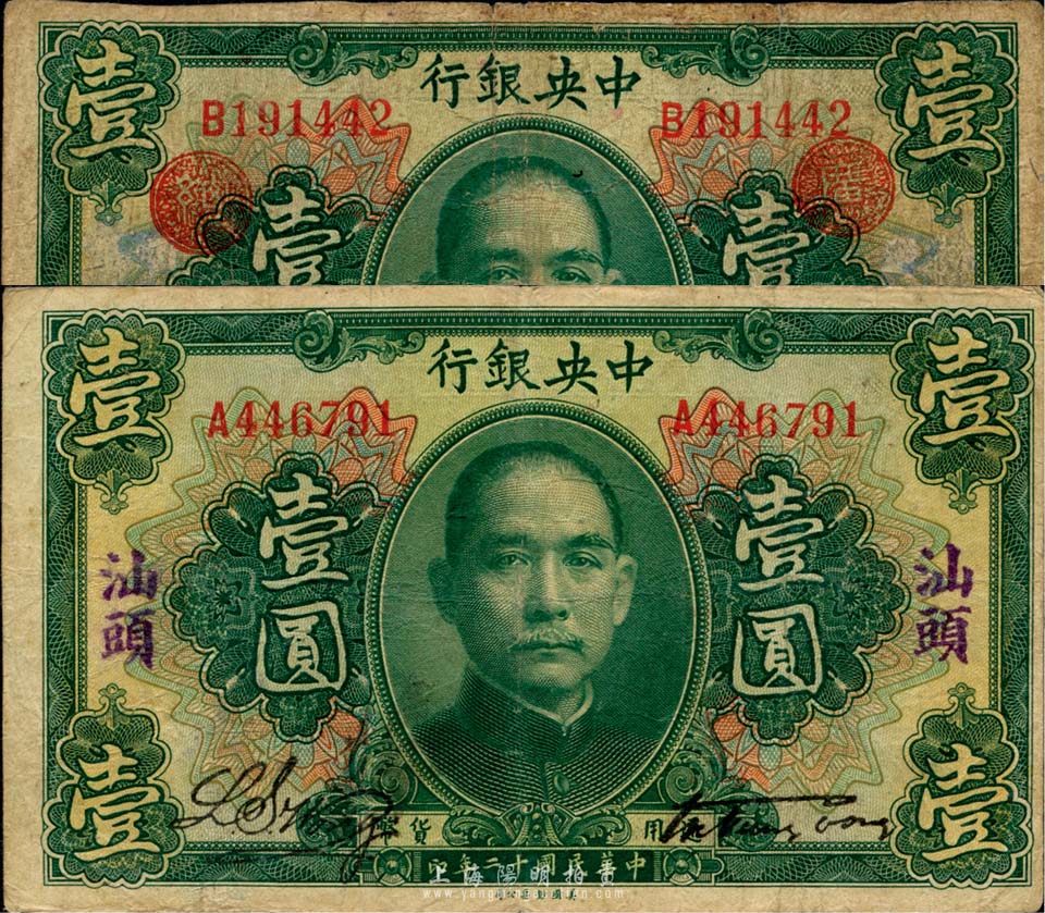 民国十二年(1923年)中央银行绿色壹圆共2种不同,分别加盖汕头地名和“广州总行”戳记;台湾藏家出品,七至八成新