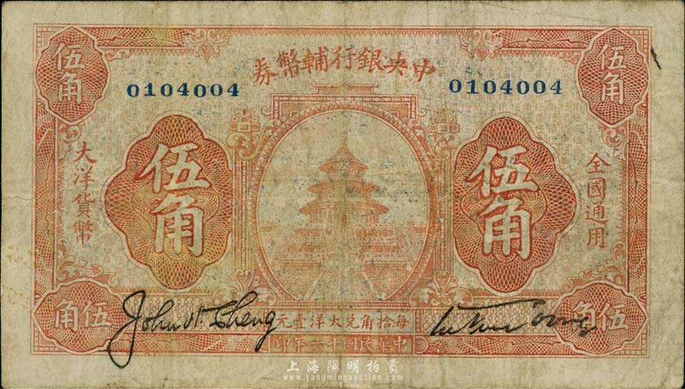 民国十六年(1927年)中央银行辅币券桔色天坛伍角,系“宁汉对立”之际武汉中央银行所发行;台湾藏家出品,七成新