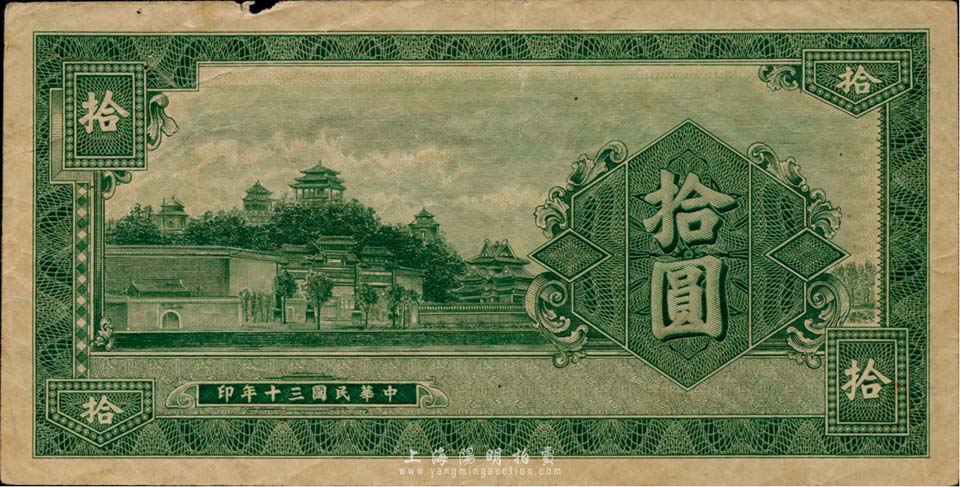 民国三十年(1941年)纸币样张拾圆,雕刻版单面印刷,背书“样张作废”字样;究其风格而言,似为中央信托局印制处代印的中央银行法币券试印票;少见,边有小损,近八成新