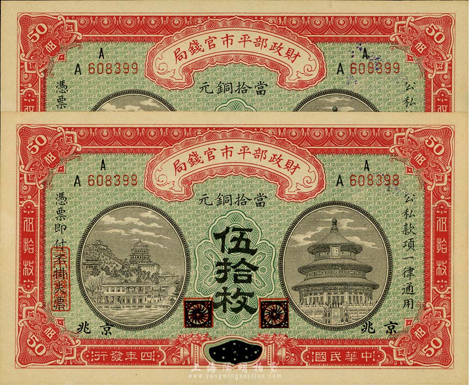民国四年(1915年)财政部平市官钱局当拾铜元伍拾枚共2枚连号,黑龙江改京兆地名,软折九六成新