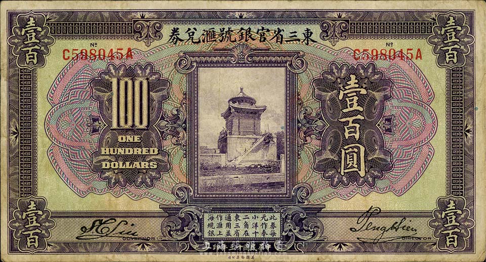 民国十三年(1924年)东三省官银号汇兑券壹百圆,台湾藏家出品,八成新