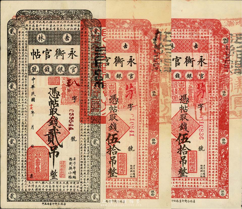民国十七年(1928年)吉林永衡官帖贰吊1枚、伍拾吊2枚,合计共3枚,八至九八成新