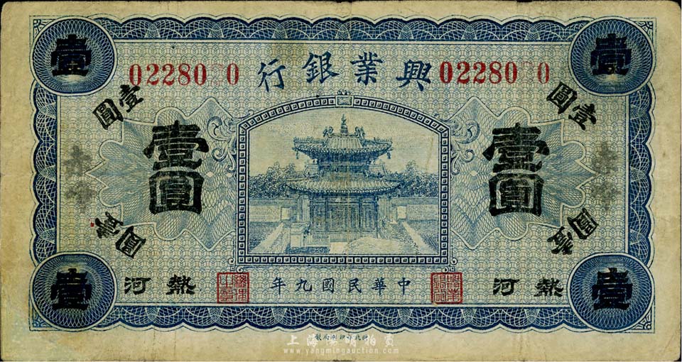 民国九年(1920年)热河兴业银行蓝色壹圆,赤峰地名,七五成新
