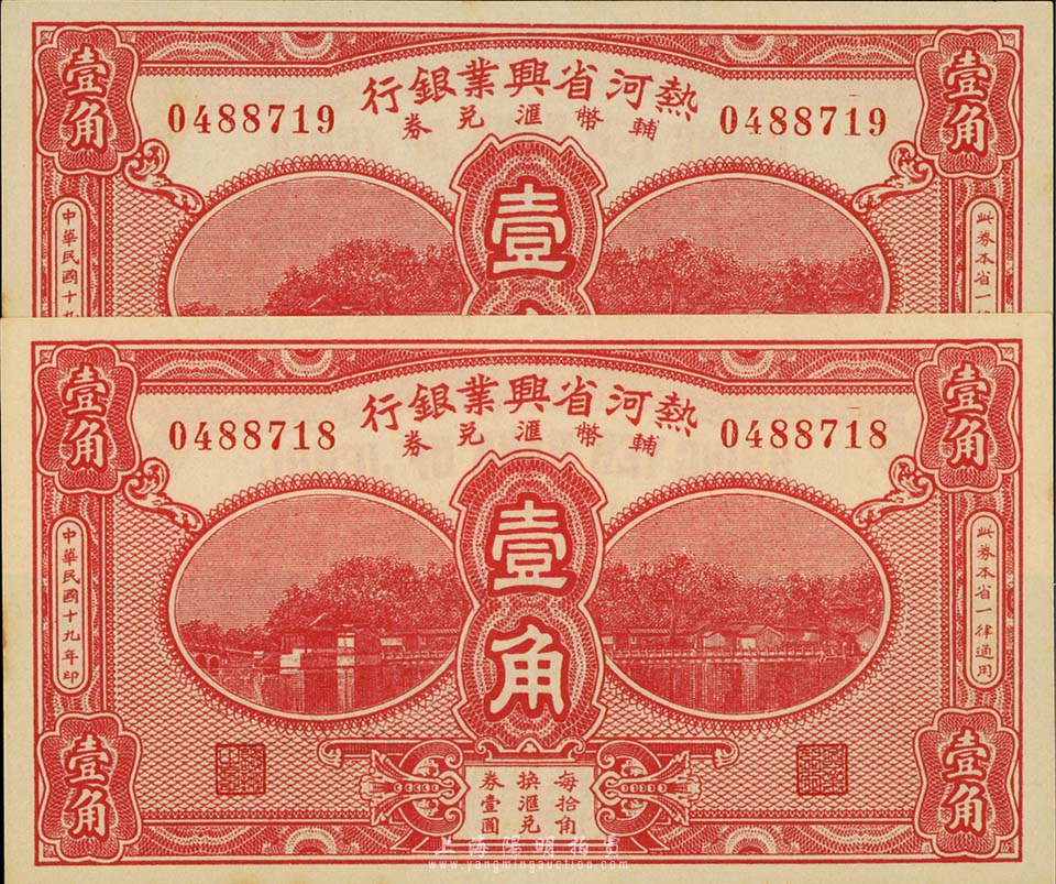 民国十九年(1930年)热河省兴业银行辅币汇兑券壹角共2枚连号,台湾藏家出品,九八成新