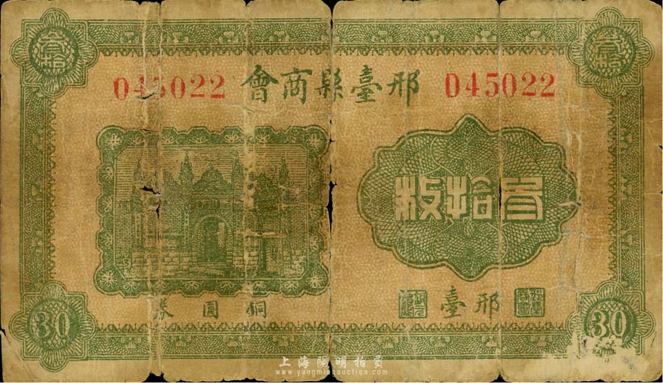 民国时期(河北)邢台县商会铜圆券叁拾枚,罕见,六五成新