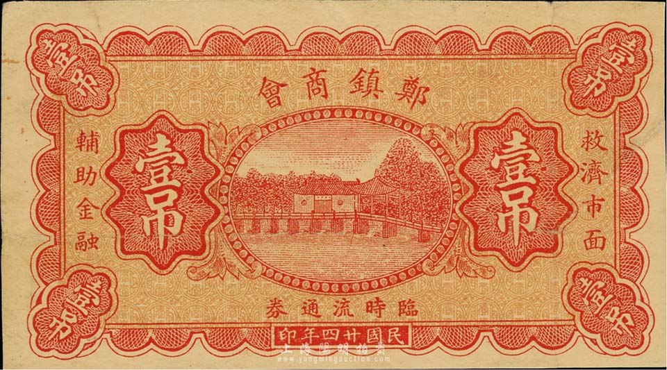 民国廿四年(1935年)郑镇商会临时流通券壹吊,北京印制,图案美观;郑镇属河北故城县,少见,八成新