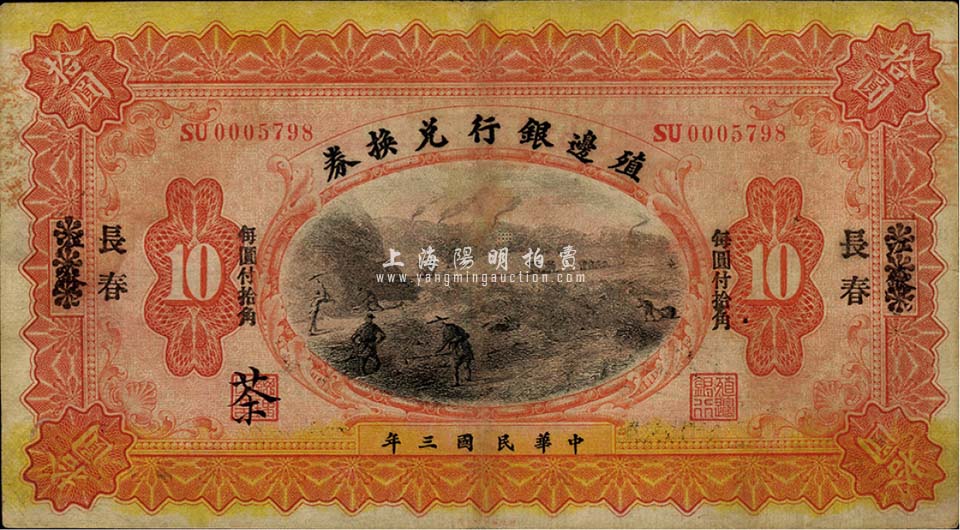 民国三年(1914年)殖边银行兑换券小洋拾圆,江苏改长春地名,“每圆付拾角”为宋体黑字,森本勇先生藏品,近八成新