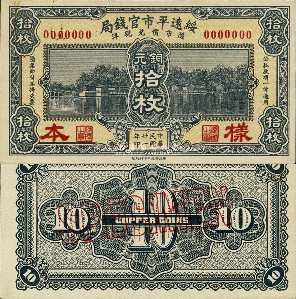 民国廿一年(1932年)绥远平市官钱局铜元拾枚样本,正背共2枚,森本勇先生藏品,源于日本前辈名家末次节雄之旧藏,少见,九八成新