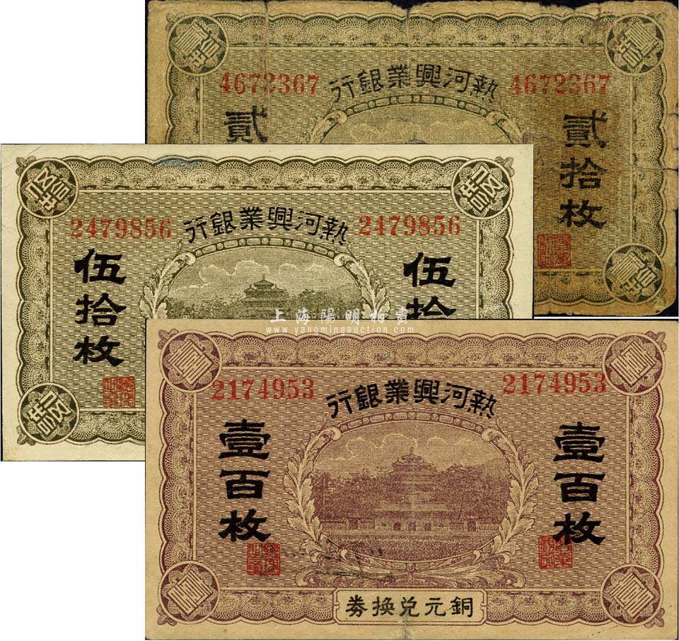 热河兴业银行铜元兑换券贰拾枚、伍拾枚、壹百枚共3种不同,均为无地名券;森本勇先生藏品,其中1枚有修补,六至九成新