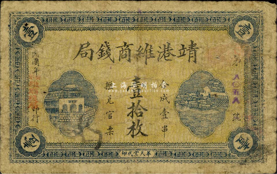 民国年·靖港维商钱局壹拾枚,该局实为地方商业银行之性质,约发行于民国初期;靖港属长沙县,乃湖南四大米市之一,其繁荣程度在全省一度仅次于长沙;森本勇先生藏品,源于日本前辈名家末次节雄之旧藏,罕见,七成新