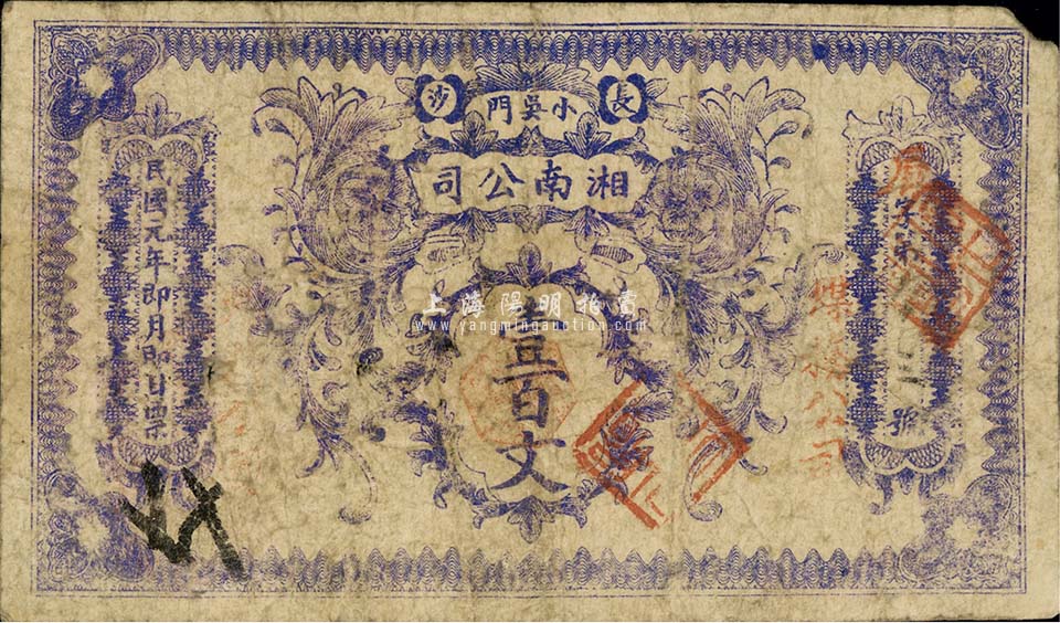 民国元年(1912年)长沙·湘南公司壹百文,森本勇先生藏品,源于日本前辈名家末次节雄之旧藏,罕见,七成新