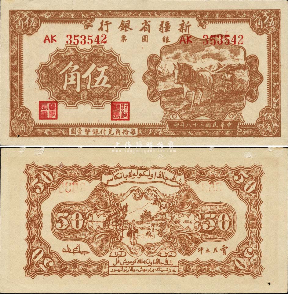 民国三十八年(1949年)新疆省银行银圆票伍角,难得之一流品相,森本勇先生藏品,九六成新