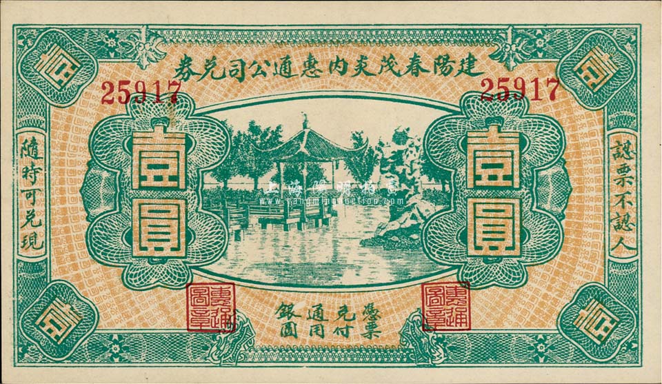 民国无年份(福建)建阳春茂炎内惠通公司兑券壹圆,上印杭州西湖风景,九八成新