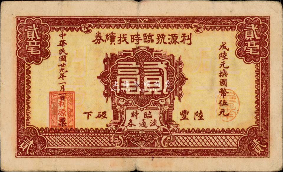 民国廿九年(1940年)利源号临时找续券贰毫,广东陆丰县民间钞票,少见,八成新