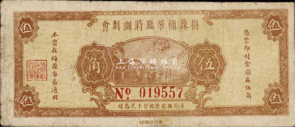 民国三十七年(1948年)梅县辅币临时调剂会金圆券伍角,由梅县县银行十足兑付,自然七成新