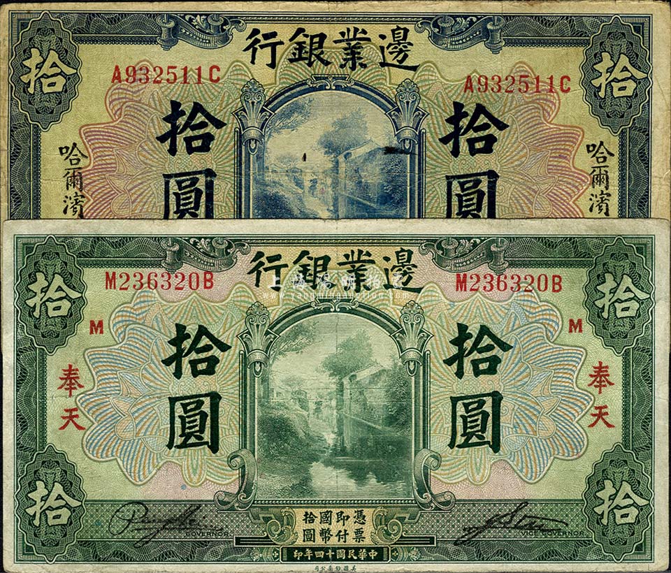 民国十四年(1925年)边业银行纸币共2种,详分:蓝色拾圆,哈尔滨地名;绿色拾圆,奉天地名;七五至八成新