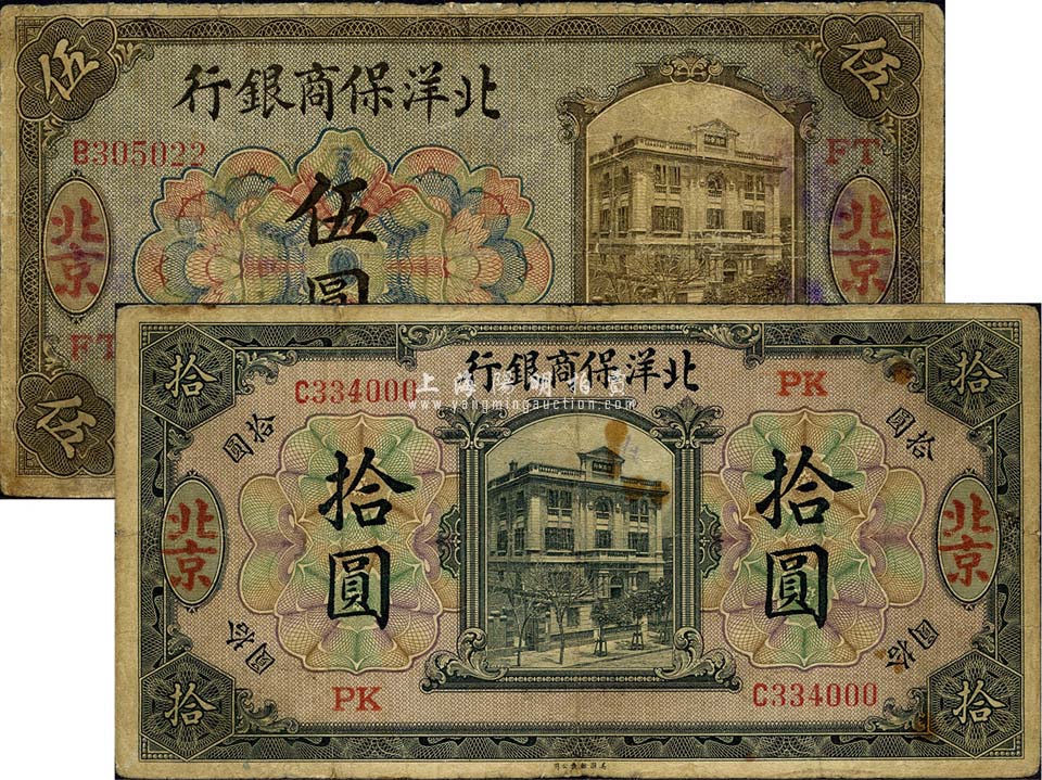 1919年北洋保商银行橄色伍圆、黑色拾圆共2枚不同,北京地名,分别加印领券“FT”和“PK”字样,少见,有小修补,七至七五成新