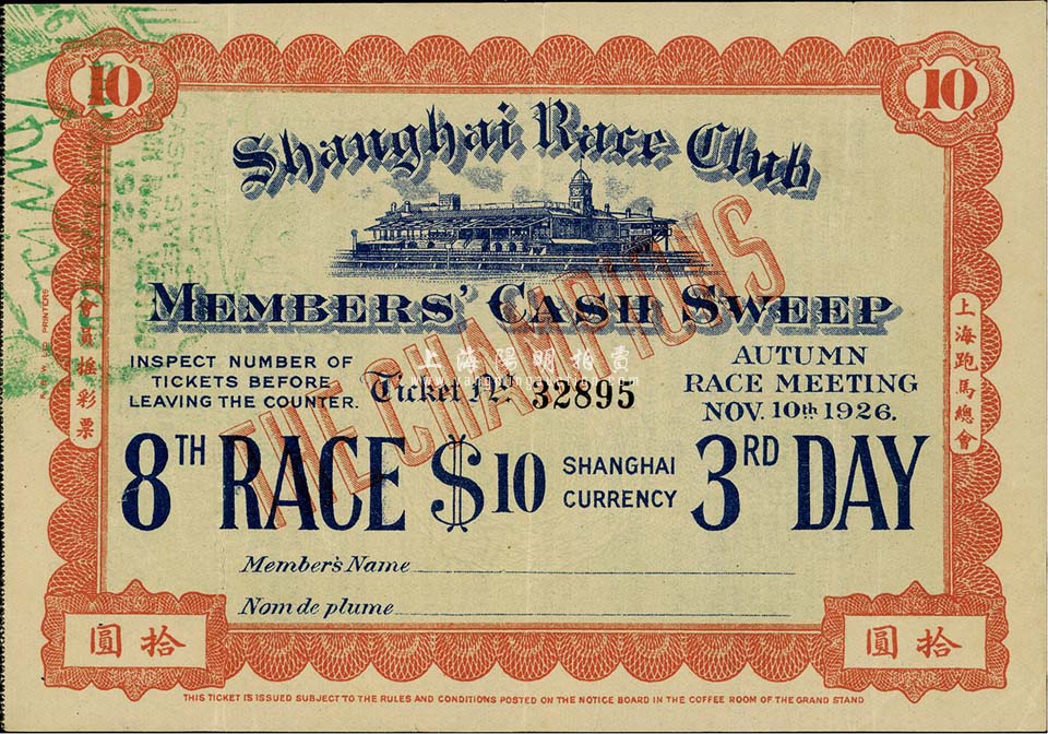 1926年上海跑马总会·会员摇彩票拾圆,少见,八成新