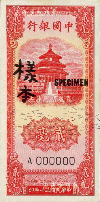 民国三十年(1941年)中国银行竖式天坛图红色贰毫,仅正面样本券,台湾藏家出品,九八成新