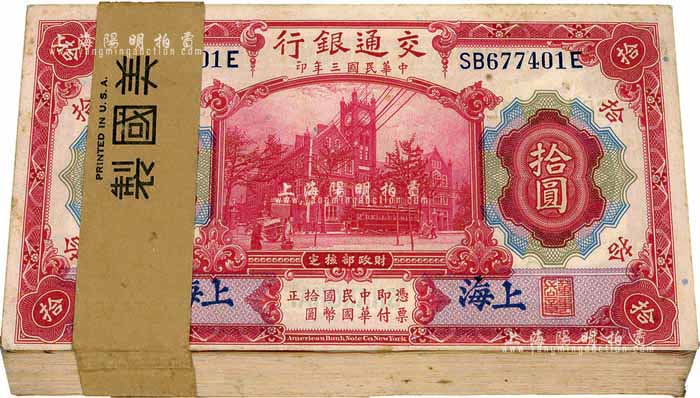 民国三年(1914年)交通银行红色拾圆原封共100枚连号,附带原封条,蓝字“上海”地名,海外回流,九八至全新,敬请预览