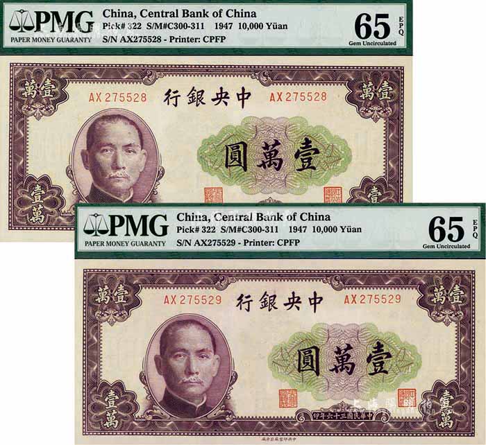 民国三十六年(1947年)中央银行北平厂壹万圆共2枚连号,全新