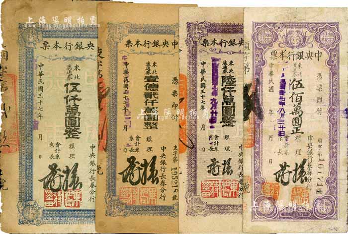 民国三十七年(1948年)中央银行长春分行本票东北流通券伍佰万圆、伍仟万圆、陆仟万圆、壹亿贰仟万圆共4枚不同,六至七五成新