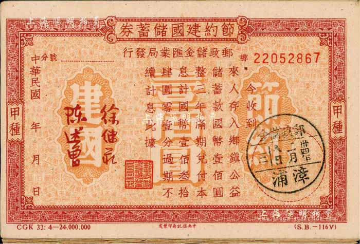 民国卅四年(1945年)节约建国储蓄券(邮政储金汇业局发行)国币壹佰圆共21枚,均盖福建省漳浦邮政储金戳,八成新