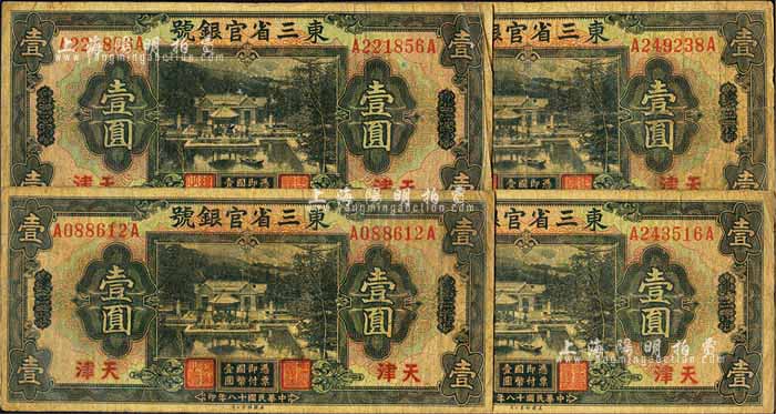 民国十八年(1929年)东三省官银号壹圆共4枚,均为东三省改天津地名,源于前辈藏家之遗存,自然七成新