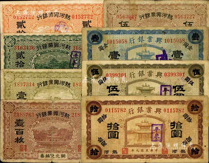 热河兴业银行纸币8种,详分:贰拾枚、伍拾枚、壹百枚;铜元兑换券赤峰贰拾枚、壹百枚;1920年蓝色壹圆、橄色伍圆、棕色拾圆,均盖“平泉”地名;台湾藏家出品,六至七五成新,敬请预览