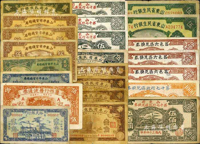 山东纸币23枚,详分:山东平市官钱总局1936年拾枚、贰拾枚、伍拾枚3枚;山东省民生银行1936年壹角4枚、贰角,1940年伍角、伍圆2枚;寿光裕民银行1941年贰角;鲁西行署流通券1939年伍角;山东省第十七行政区兑换券1945年伍佰圆4枚、壹仟圆;昌邑六区兑换券1944年伍佰圆3枚;五至八五成新,敬请预览