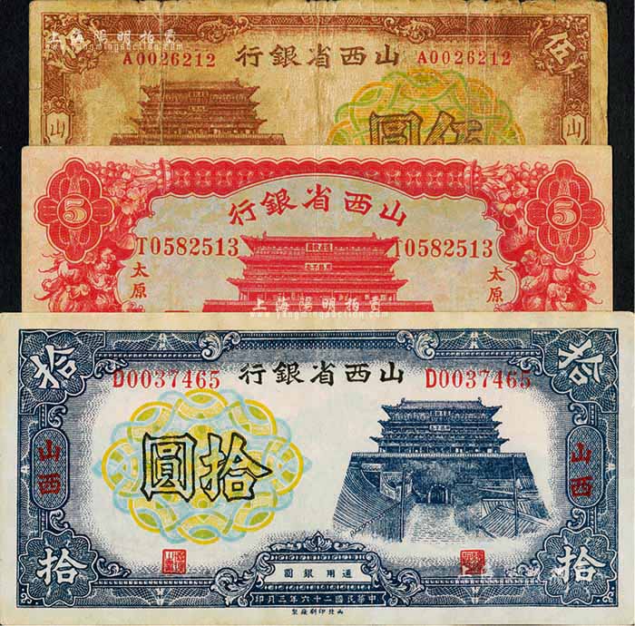 山西省银行纸币3种,详分:1933年伍圆,太原地名,九成新;1937年伍圆、拾圆,山西地名,分别为六至九五成新