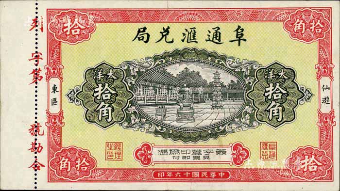 民国十六年(1927年)阜通汇兑局大洋拾角,福建仙游县侨汇业钞票,图案美观,九五成新