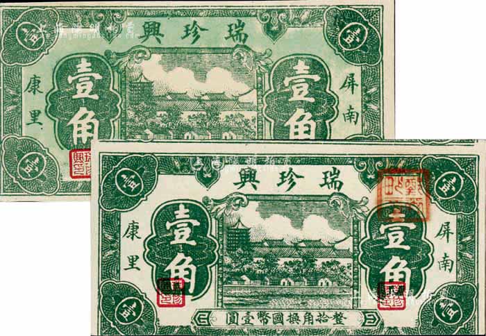 福建(屏南)瑞珍兴壹角共2枚不同,其中:1枚为绿色底纹券;另1枚为白色底纹券,且上下印刷移位;九八成新